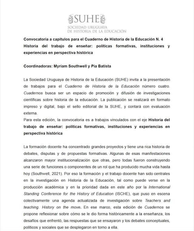 Convocatoria para participar en el Cuaderno 4 de Historia de la Educación de la SUHE