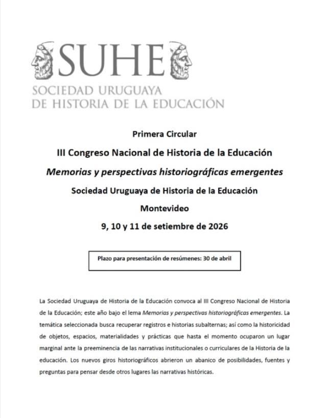 La Sociedad Uruguaya de Historia de la Educación convoca al III Congreso Nacional de Historia de la Educación; este año bajo el lema Memorias y perspectivas historiográficas emergentes. La temática seleccionada busca recuperar registros e historias subalternas; así como la historicidad de objetos, espacios, materialidades y prácticas que hasta el momento ocuparon un lugar marginal ante la preeminencia de las narrativas institucionales o curriculares de la Historia de la educación. Los nuevos giros historiográficos abrieron un abanico de posibilidades, fuentes y preguntas para pensar desde otros lugares las narrativas históricas.