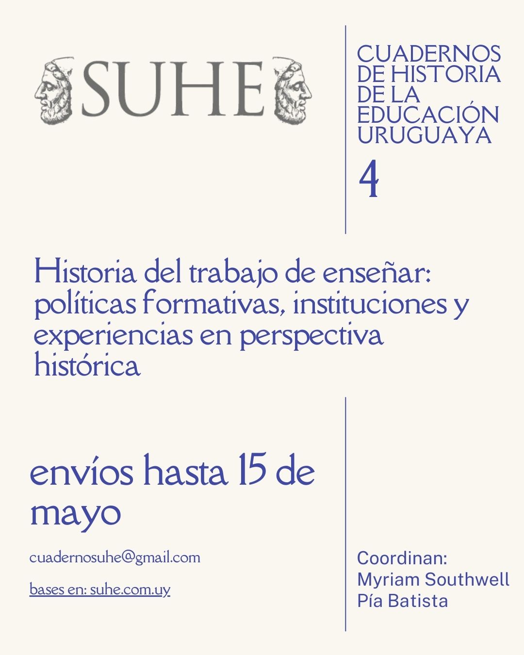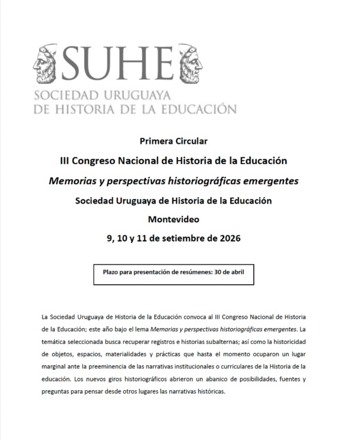 Convocatoria para participar en el Cuaderno 4 de Historia de la Educación de la SUHELa SUHE convoca a la presentación de trabajos para el Cuaderno de Historia de la Educación, volumen cuatro Para esta edición, la convocatoria es a trabajos vinculados con el eje Historia del trabajo de enseñar: políticas formativas, instituciones y experiencias en perspectiva histórica Coordinadoras: Myriam Southwell y Pía Batista La publicación se realizará en formato impreso y digital, bajo el sello editorial de la SUHE, y contará con evaluación Recepción de trabajos: hasta 30 de abril 2026 Envíos a: cuadernosuhe@gmail.com